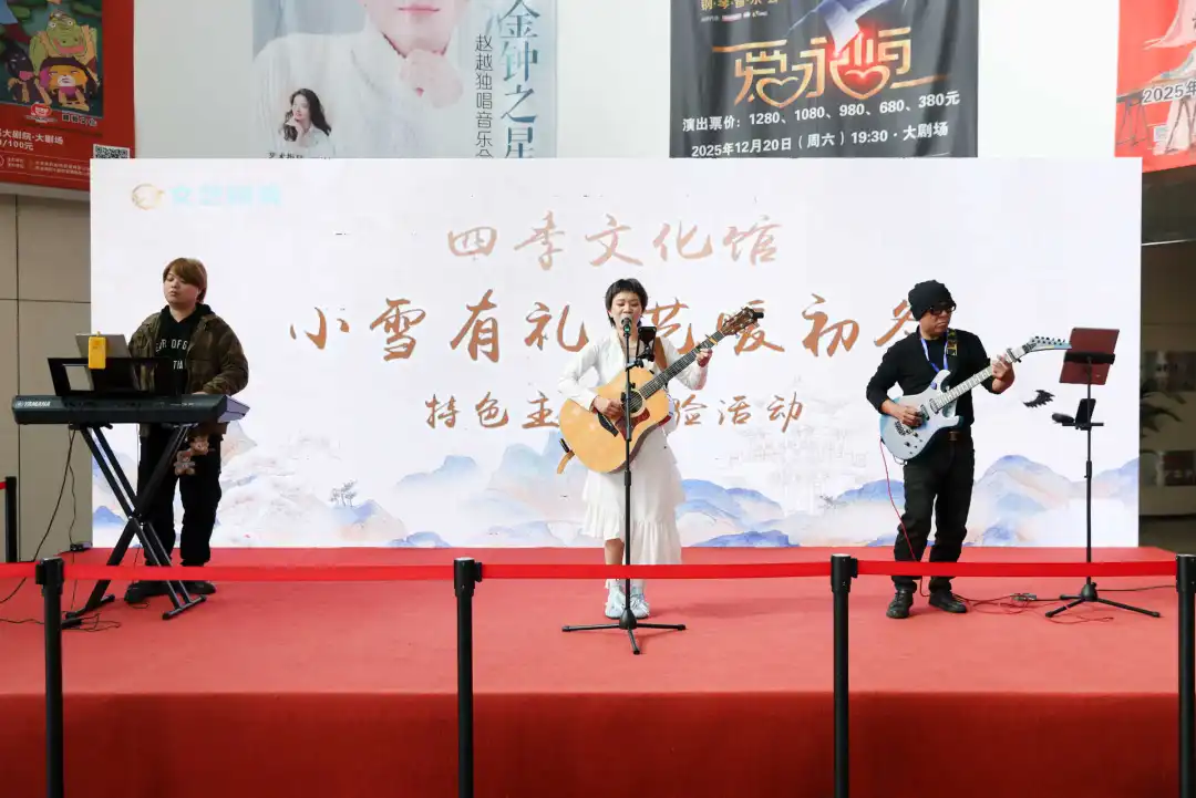 与舞台展演同步,剧院一楼大厅四季文化馆特色主题体验活动如期开展。"冬藏珠珀"多肉盆栽派送摊位前排起长队,20位市民领取多肉植物;书法老师现场挥毫,30份墨香书签成为最雅致的小雪礼物;脸部彩绘区的孩子们顶着"雪花""动物"妆容穿梭嬉戏,钩编老师手中的毛线编织成小挂件。最受欢迎的Live舞台上,现场乐队带来金曲无限,让未能入场的市民也获得了近距离感受艺术魅力的机会,构成冬日里最温馨的文化图景。