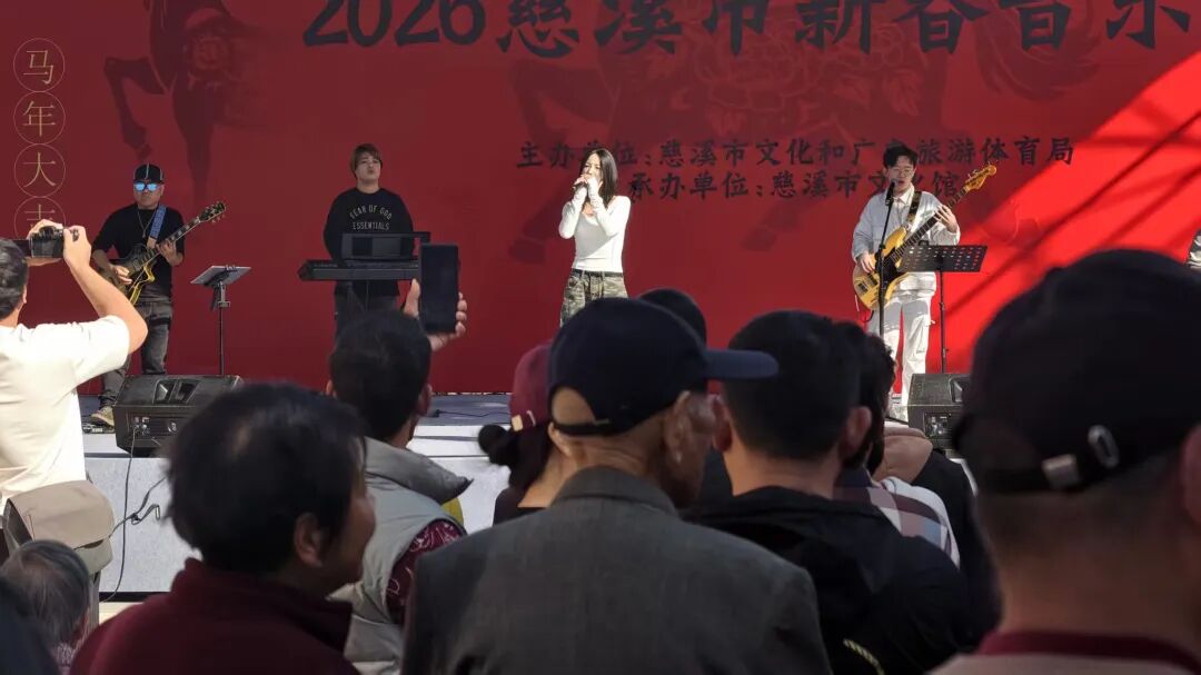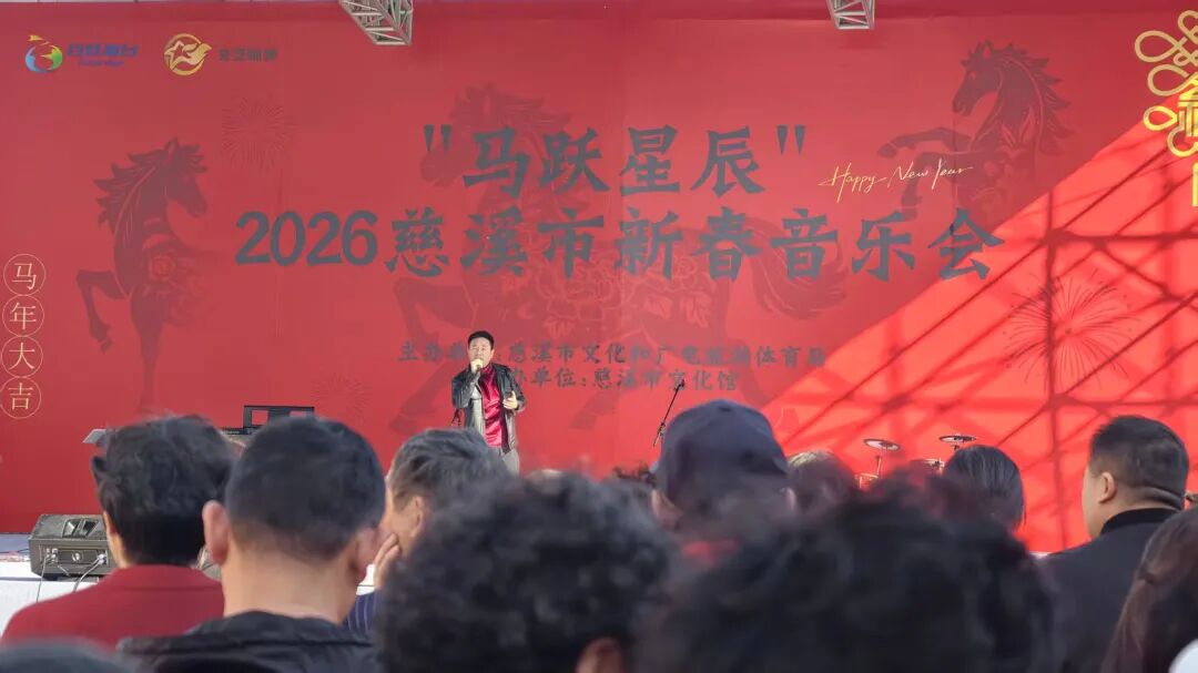 2月21日下午,“马跃星辰”2026慈溪市新春音乐会在慈溪市新河坊圆满举行。本次活动由慈溪市文化和广电旅游体育局主办,慈溪市文化馆承办,以激昂的旋律和真挚的祝福,为市民们献上了一场精彩纷呈的新春文化盛宴。音乐会现场氛围热烈,红色的主题背景洋溢着浓浓的年味,让到场观众沉浸在新春的喜悦之中。演出在热闹的乐队开场曲中拉开帷幕,瞬间点燃了现场气氛。